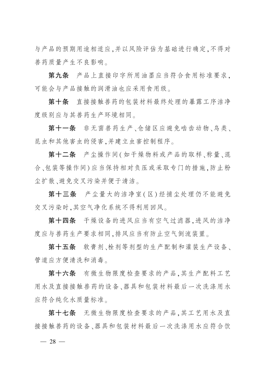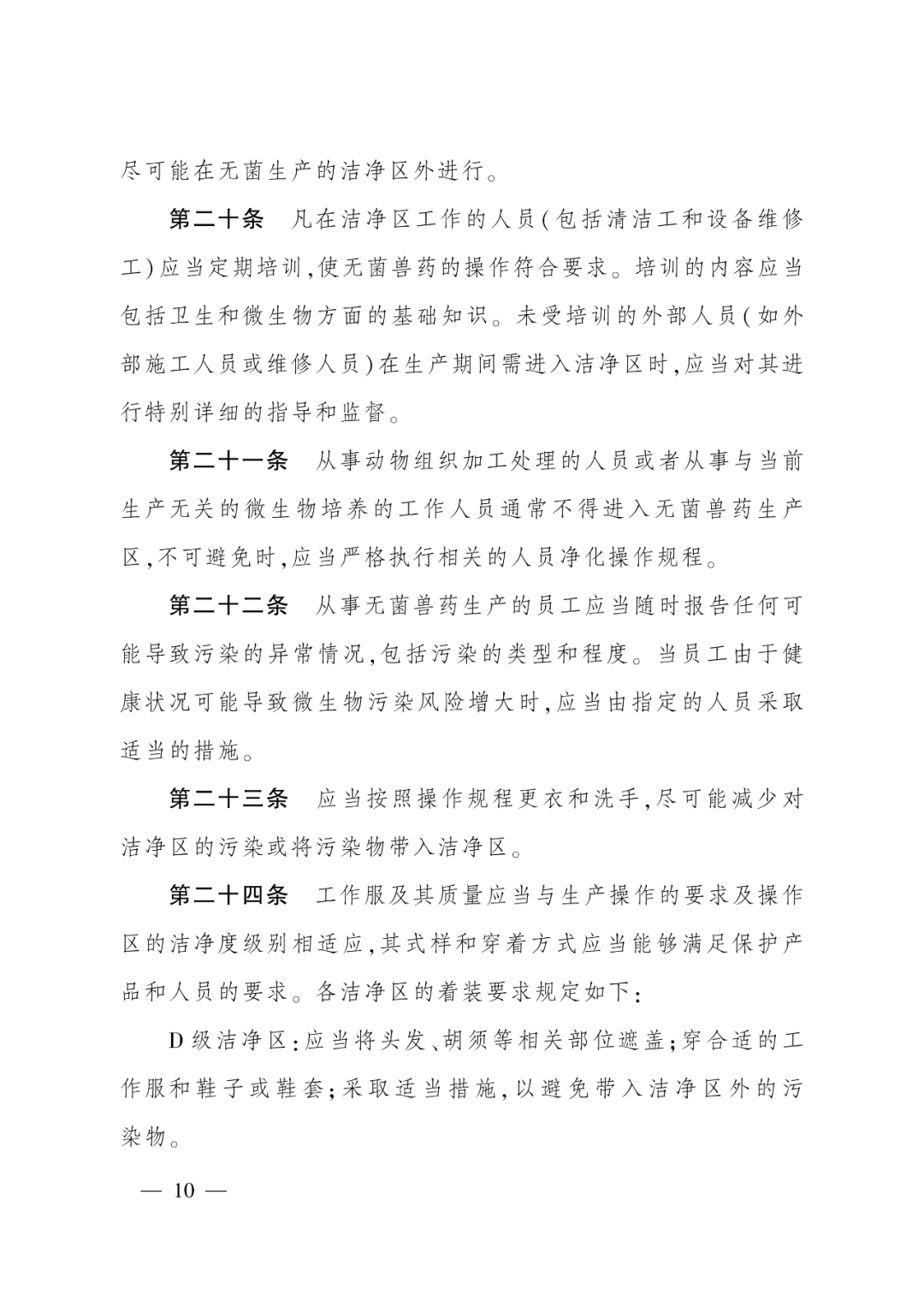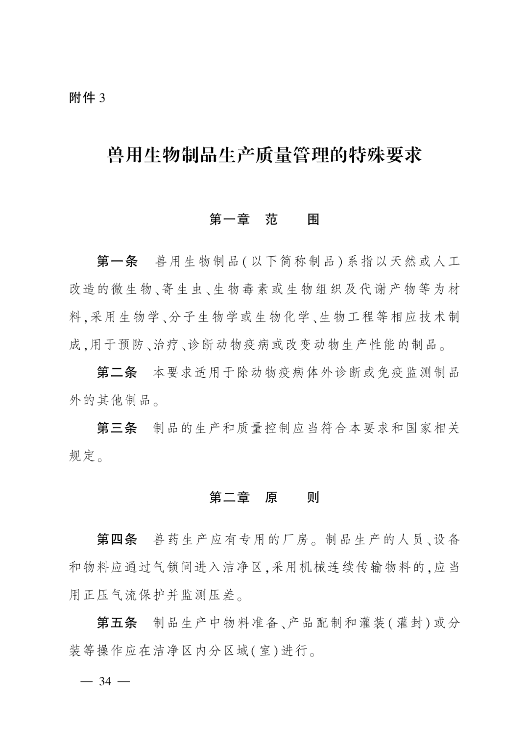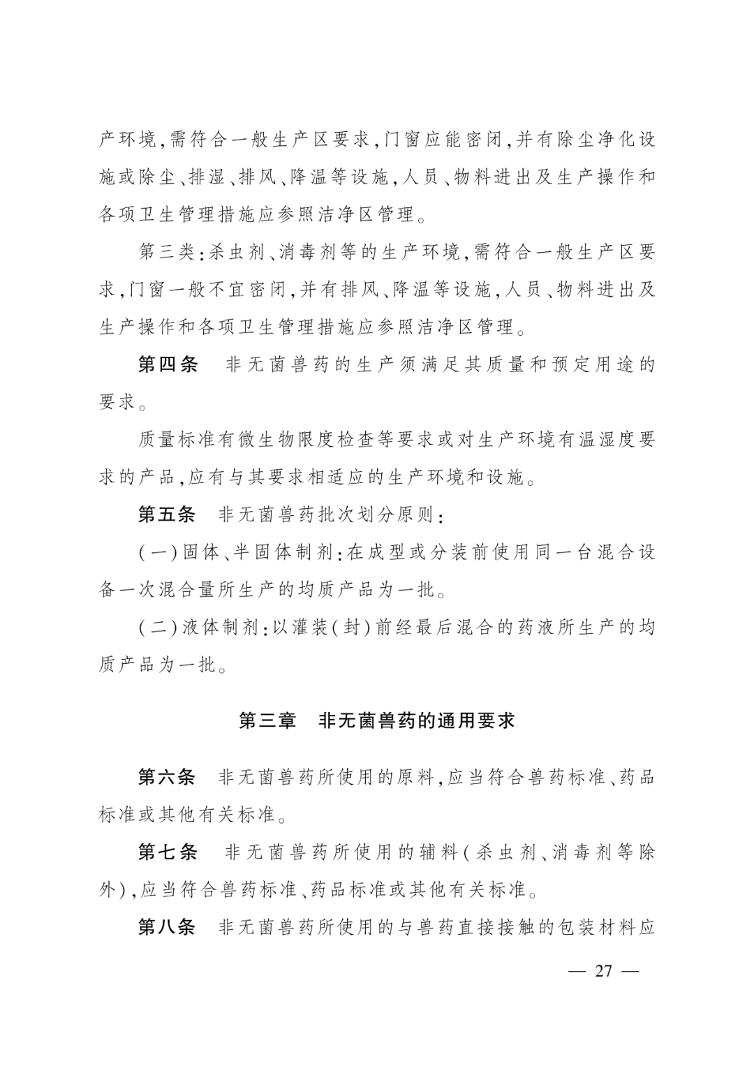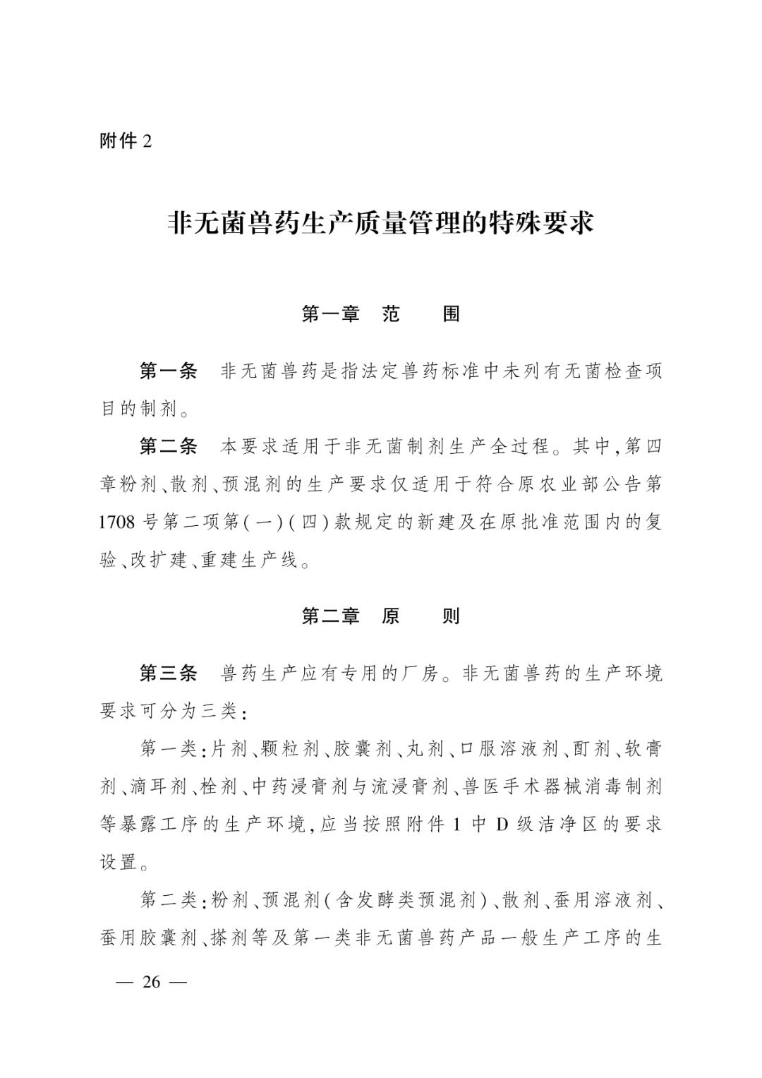 根据《兽药生产质量管理规范(2020年修订)》第二百八十五条规定,现发布无菌兽药、非无菌兽药、兽用生物制品、原料药、中药制剂等5类兽药生产质量管理的特殊要求,作为《兽药生产质量管理规范(2020年修订)》配套文件,自2020年6月1日起施行。