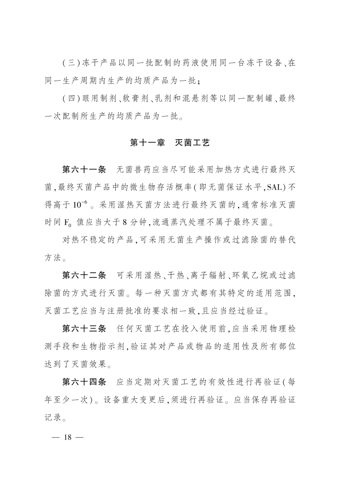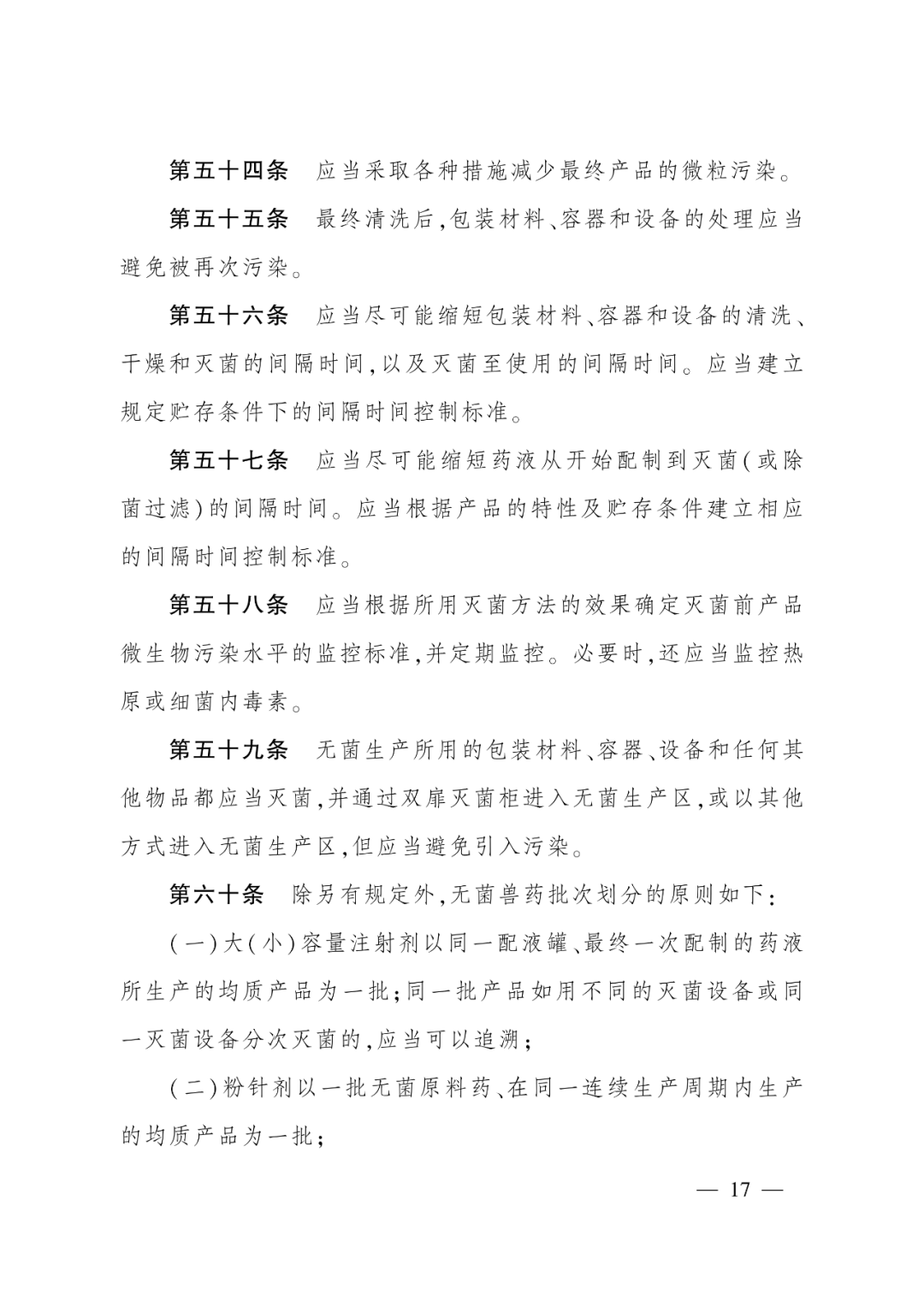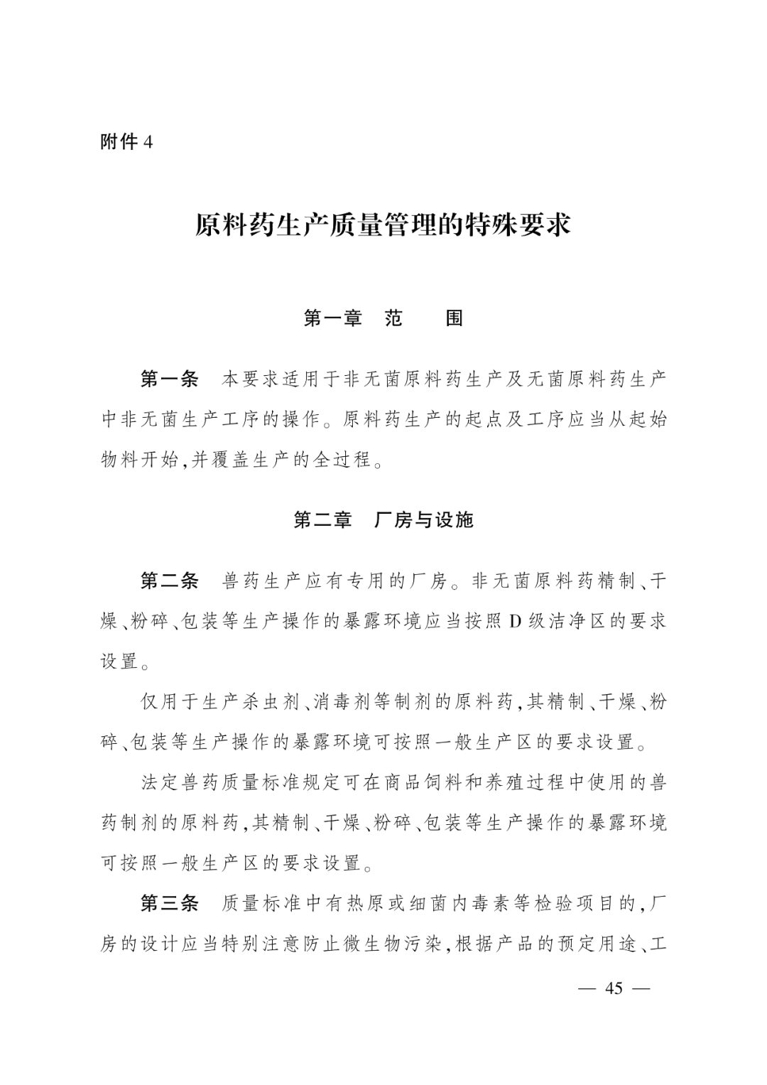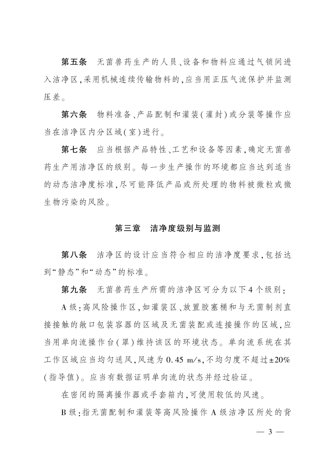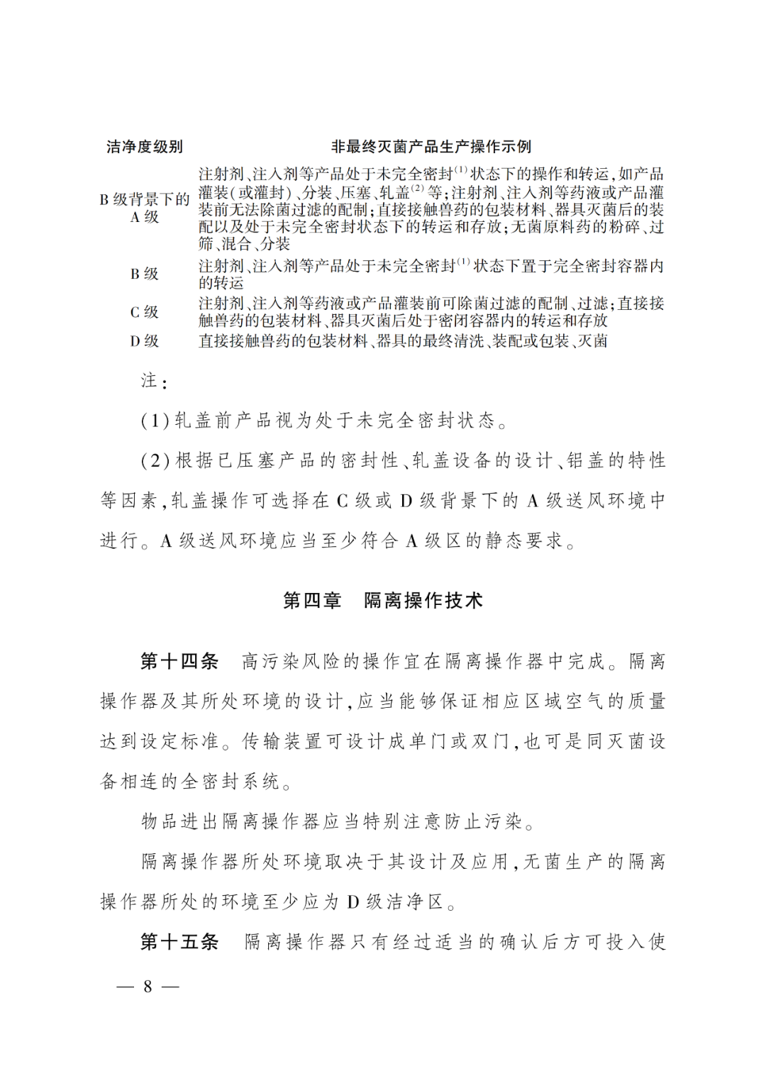 根据《兽药生产质量管理规范(2020年修订)》第二百八十五条规定,现发布无菌兽药、非无菌兽药、兽用生物制品、原料药、中药制剂等5类兽药生产质量管理的特殊要求,作为《兽药生产质量管理规范(2020年修订)》配套文件,自2020年6月1日起施行。