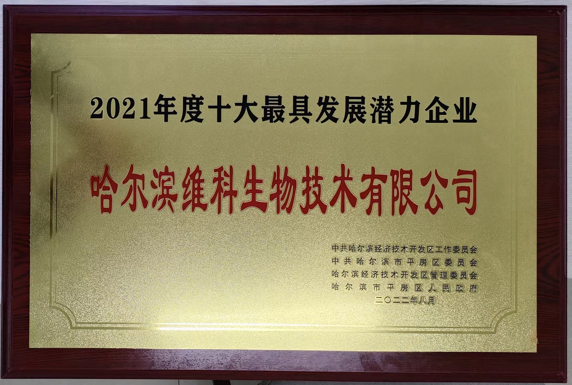 9月20日,哈经开区、平房区工业强区大会在哈经开区平房区第二办公区五楼多功能厅举行,会上,市委副书记、市长张起翔等领导对获得表彰奖励的优秀企业进行颁奖,哈尔滨维科生物技术有限公司获2021年度最具发展潜力企业荣誉称号。