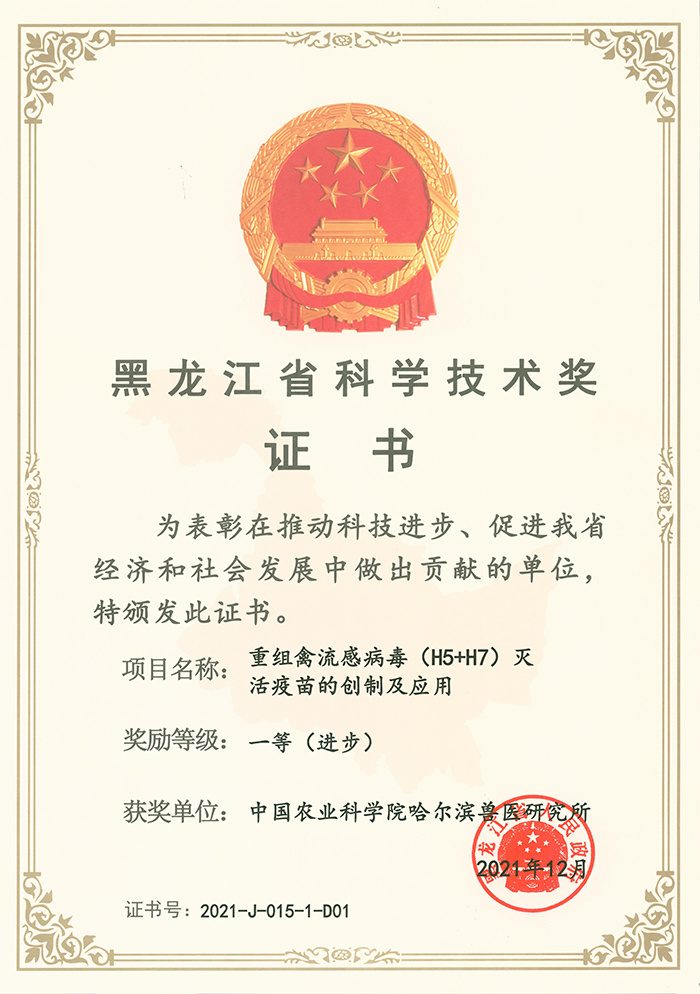 "重组禽流感病毒(H5+H7)灭活疫苗的创制及应用"喜获2021年度黑龙江省科学技术进步一等奖
