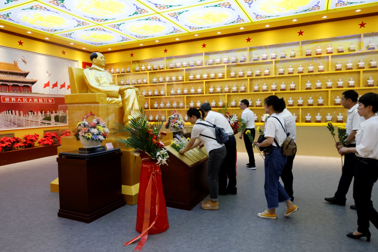 向毛主席纪念像敬献菊花